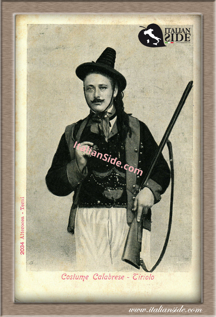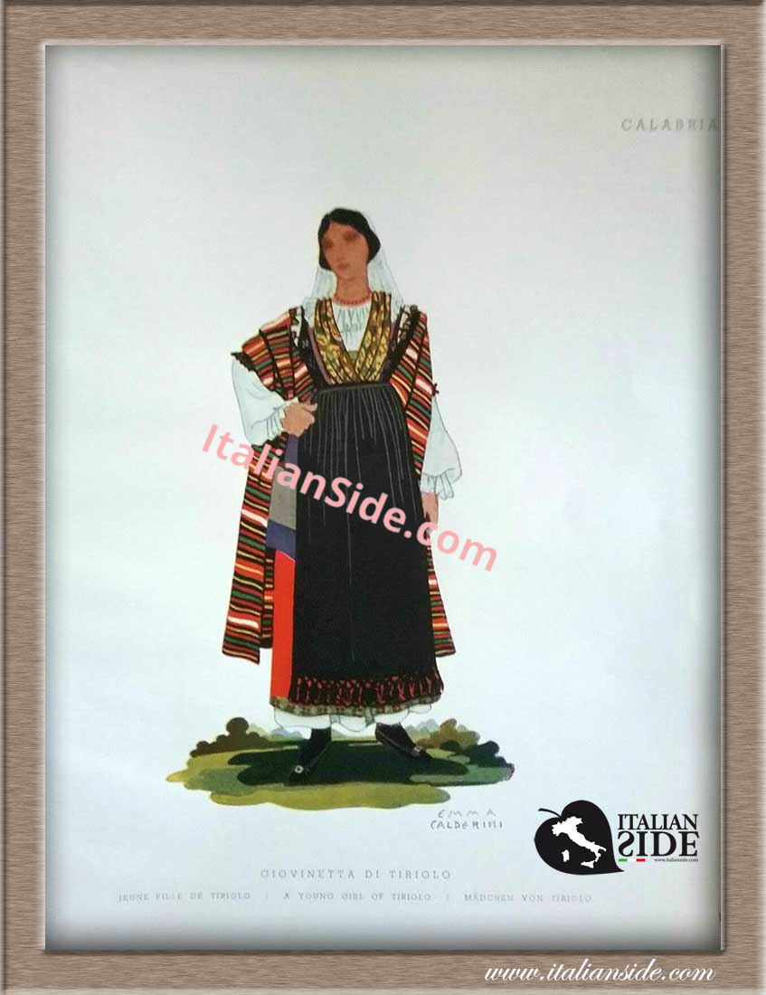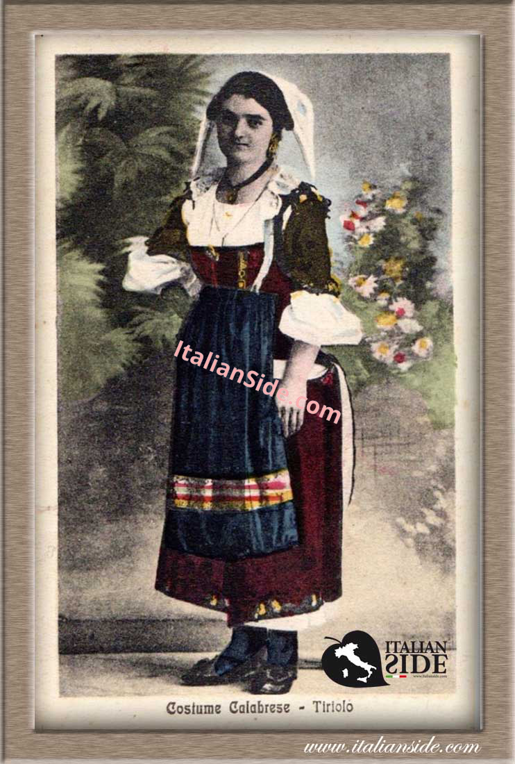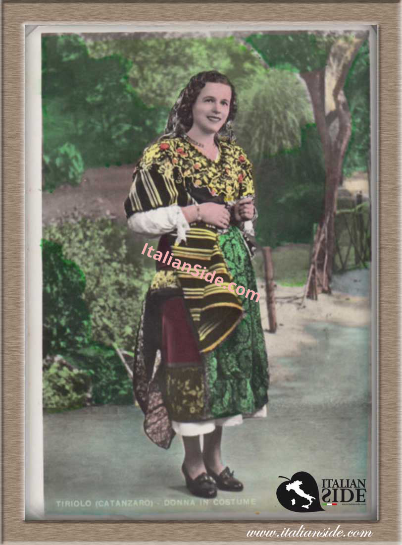 Los trajes usados en Tiriolo estaban entre los más pintorescos de Italia. Sobre una camisa completa adornada en el cuello y las muñecas, las mujeres solteras llevaban un largo capote rojo de tela, bordeado con cintas, sobre los hombros. Sus faldas eran de algodón azul con una banda de otro material alrededor. Se usaban delantales de seda y corpiños también de seda, estos últimos con mangas sueltas atadas a los hombros con cintas. A este traje se añadía un largo chal de lana hilada a mano.